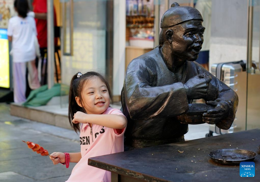 A girl is pictured near an urban sculpture at Qianmen Street in Beijing, capital of China, July 17, 2024. (Xinhua/Zhang Chenlin)