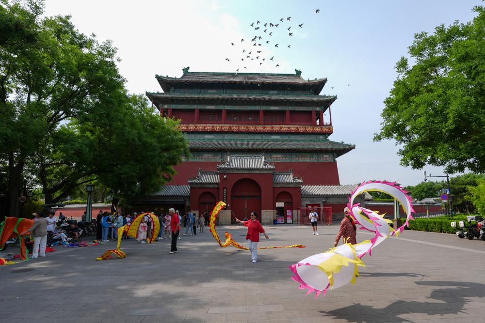 Citizens exercise at a square in front of the Bell and Drum Towers in Beijing, capital of China, June 2, 2024. The United Nations Educational, Scientific and Cultural Organization (UNESCO) on Saturday announced the inclusion of the Beijing Central Axis: A Building Ensemble Exhibiting the Ideal Order of the Chinese Capital, into its world heritage list.