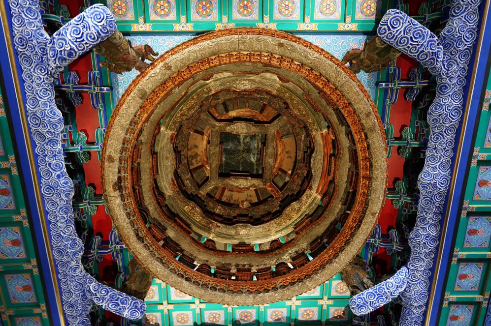 This photo taken on July 17, 2024 shows a caisson ceiling of the Longfu Temple displayed in the worship hall of the Altar of the God of Agriculture in Beijing, capital of China. The United Nations Educational, Scientific and Cultural Organization (UNESCO) on Saturday announced the inclusion of the Beijing Central Axis: A Building Ensemble Exhibiting the Ideal Order of the Chinese Capital, into its world heritage list.