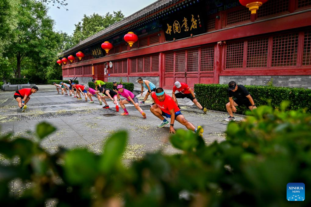 Running enthusiasts warm up in front of a bookstore at Di'anmen Gate in Beijing, capital of China, July 20, 2024. The Beijing Central Axis is a running route full of cultural vibe in the eyes of running enthusiasts. (Xinhua/Liu Jinhai)
