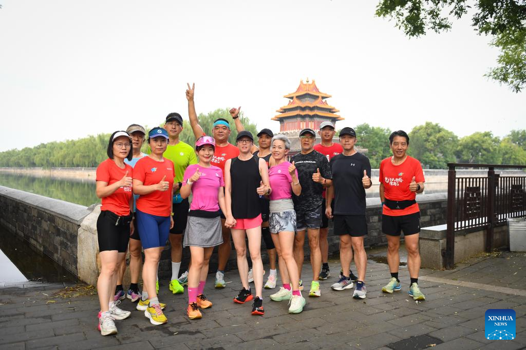 Running enthusiasts pose for a group photo in front of a turret of the Forbidden City in Beijing, capital of China, July 20, 2024. The Beijing Central Axis is a running route full of cultural vibe in the eyes of running enthusiasts. (Xinhua/Chen Zhonghao)