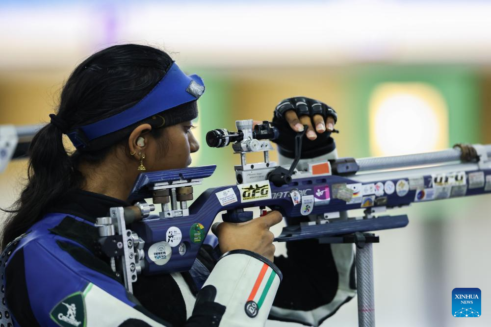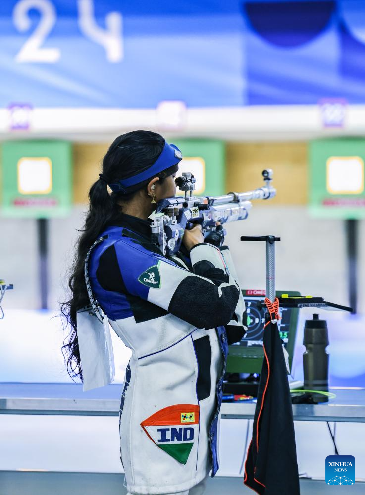 Ramita Ramita of India competes during the 10m air rifle women's qualification of shooting at the Paris 2024 Olympic Games in Chateauroux, France, on July 28, 2024. (Xinhua/Zhang Fan)