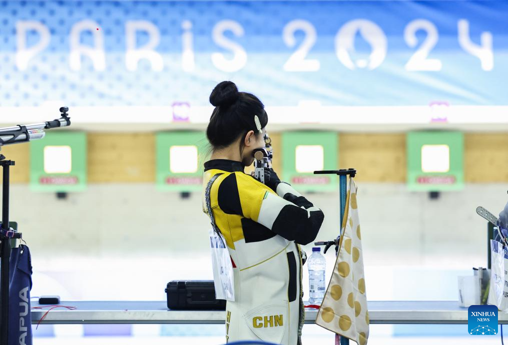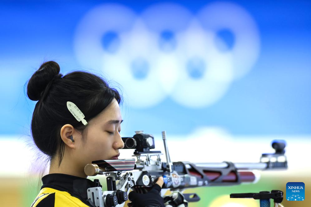 Huang Yuting of China competes during the 10m air rifle women's qualification of shooting at the Paris 2024 Olympic Games in Chateauroux, France, on July 28, 2024. (Xinhua/Zhang Fan)