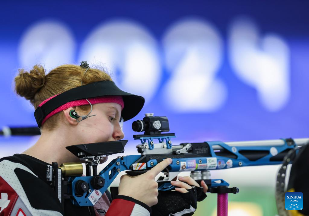 Alexandra Le of Kazakhstan competes during the 10m air rifle women's qualification of shooting at the Paris 2024 Olympic Games in Chateauroux, France, on July 28, 2024. (Xinhua/Zhang Fan)