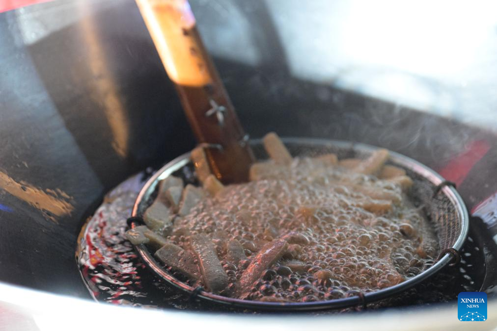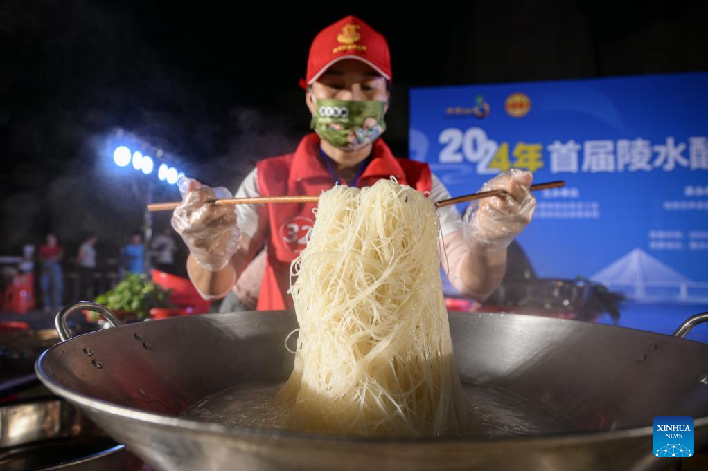 A competitor makes Lingshui sour rice noodles during a sour rice noodle cooking competition in Lingshui, south China's Hainan Province, July 26, 2024. Lingshui sour rice noodle is a popular local snack and was listed as a provincial-level intangible cultural heritage in 2009. Recently a cooking competition was held in Lingshui to promote the sour rice noodle industry. (Xinhua/Pu Xiaoxu)