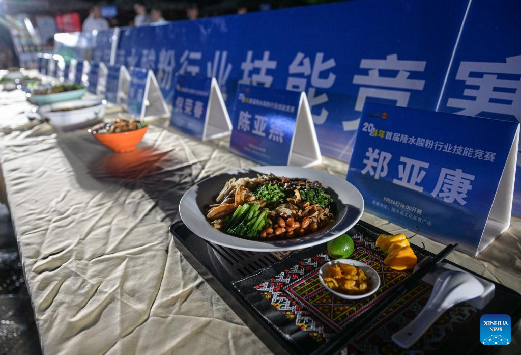 A dish of Lingshui sour rice noodles made by a competitor is pictured during a sour rice noodle cooking competition in Lingshui, south China's Hainan Province, July 26, 2024. Lingshui sour rice noodle is a popular local snack and was listed as a provincial-level intangible cultural heritage in 2009. Recently a cooking competition was held in Lingshui to promote the sour rice noodle industry. (Xinhua/Pu Xiaoxu)
