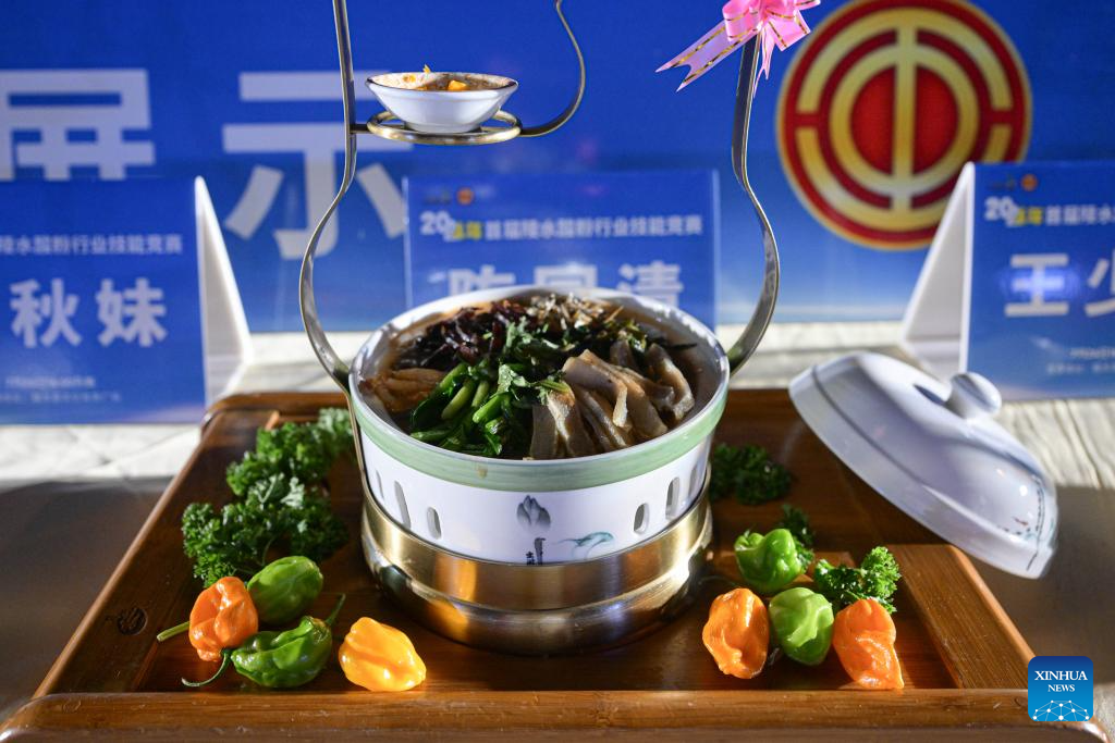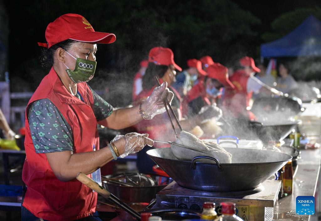 Competitors make Lingshui sour rice noodles during a sour rice noodle cooking competition in Lingshui, south China's Hainan Province, July 26, 2024. Lingshui sour rice noodle is a popular local snack and was listed as a provincial-level intangible cultural heritage in 2009. Recently a cooking competition was held in Lingshui to promote the sour rice noodle industry. (Xinhua/Pu Xiaoxu)