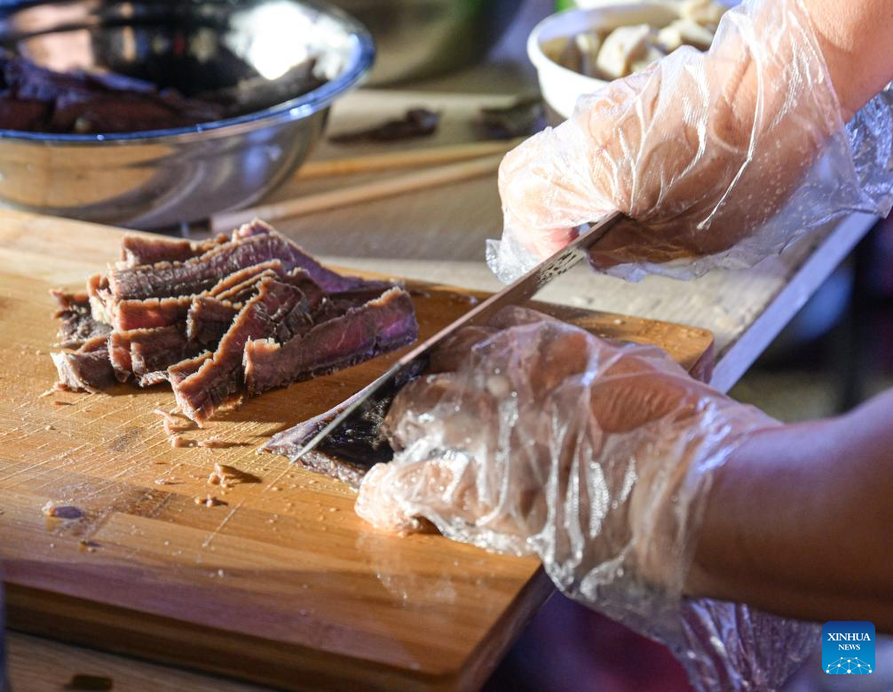 An assistant of a competitor slices dried meat during a sour rice noodle cooking competition in Lingshui, south China's Hainan Province, July 26, 2024. Lingshui sour rice noodle is a popular local snack and was listed as a provincial-level intangible cultural heritage in 2009. Recently a cooking competition was held in Lingshui to promote the sour rice noodle industry. (Xinhua/Pu Xiaoxu)