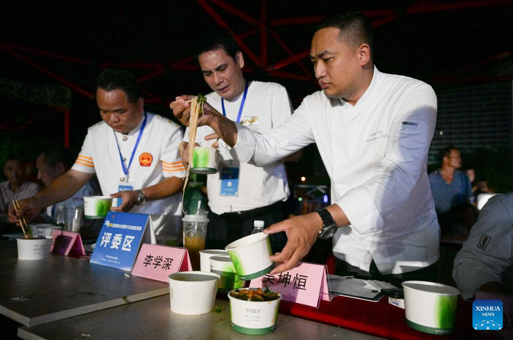 Referees taste Lingshui sour rice noodles during a sour rice noodle cooking competition in Lingshui, south China's Hainan Province, July 26, 2024. Lingshui sour rice noodle is a popular local snack and was listed as a provincial-level intangible cultural heritage in 2009. Recently a cooking competition was held in Lingshui to promote the sour rice noodle industry. (Xinhua/Pu Xiaoxu)