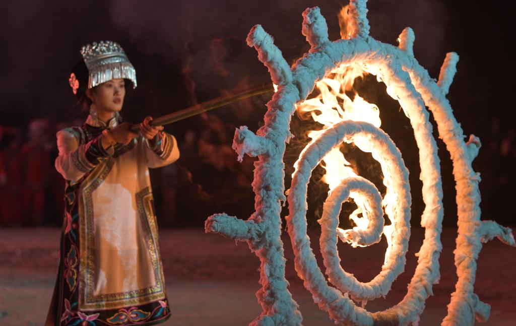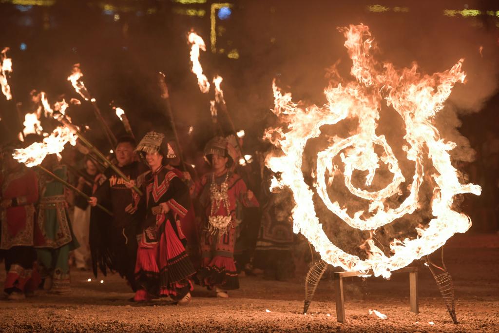 Actors perform traditional dance during the annual Torch Festival of Yi ethnic group held in Weining County, southwest China's Guizhou Province, July 29, 2024. (Xinhua/Yang Wenbin)Actors perform during the annual Torch Festival of Yi ethnic group held in Weining County, southwest China's Guizhou Province, July 29, 2024. (Xinhua/Yang Wenbin)A torchbearer lights up a fire ring during the annual Torch Festival of Yi ethnic group held in Weining County, southwest China's Guizhou Province, July 29, 2024. (Xinhua/Yang Wenbin)Women in traditional costumes take part in the annual Torch Festival of Yi ethnic group held in Weining County, southwest China's Guizhou Province, July 29, 2024. (Xinhua/Yang Wenbin)An aerial drone photo taken on July 29, 2024 shows people celebrating the annual Torch Festival of Yi ethnic group in Weining County, southwest China's Guizhou Province. (Xinhua/Yang Wenbin)