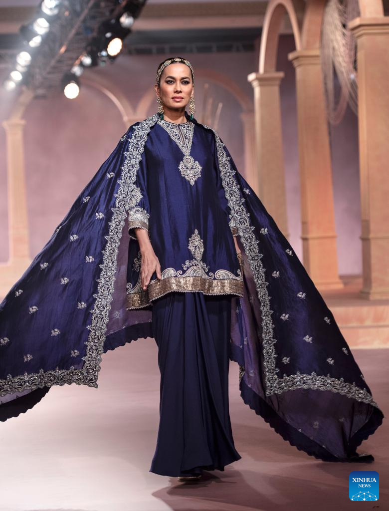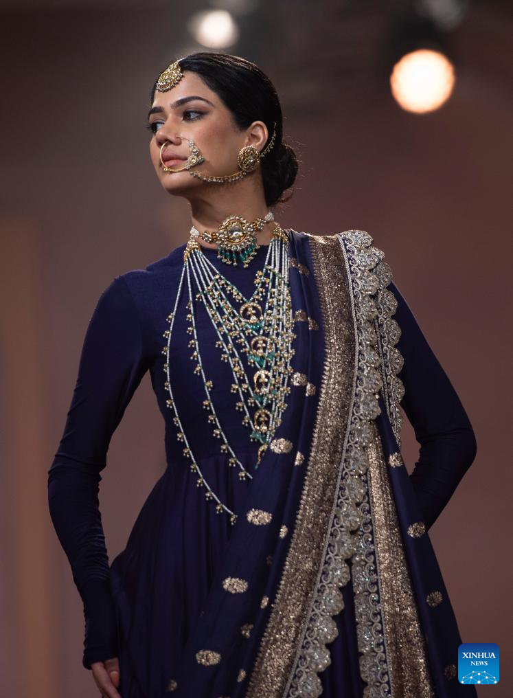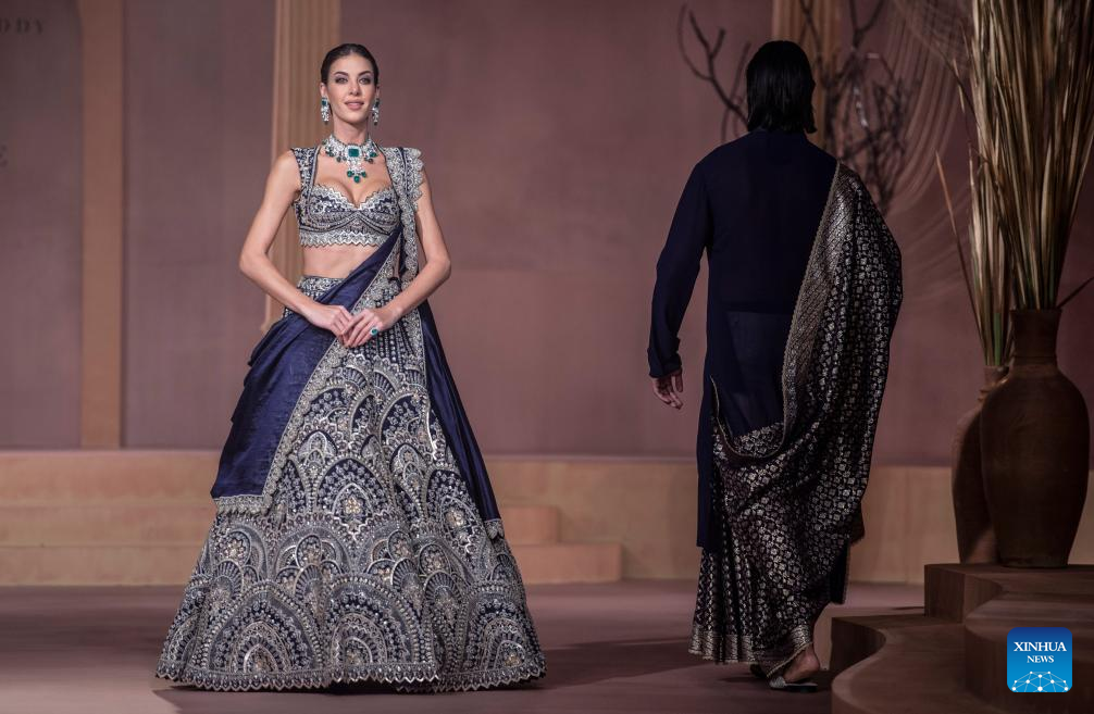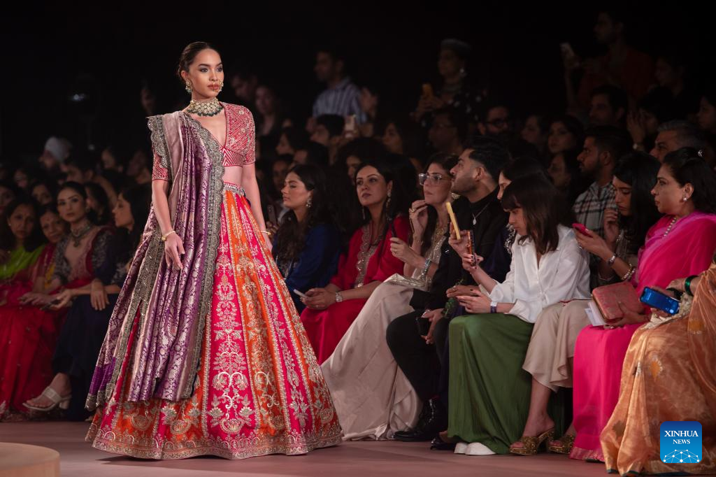 A model presents a creation of Jayanti Reddy during the FDCI India Couture Week in New Delhi, on July 29, 2024. (Xinhua/Javed Dar)