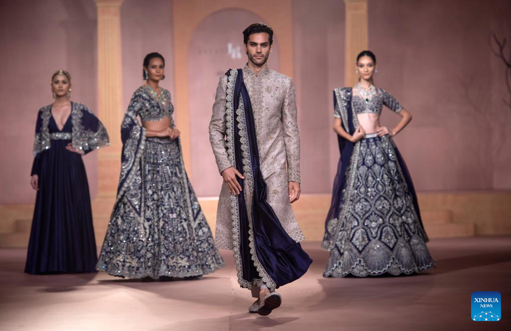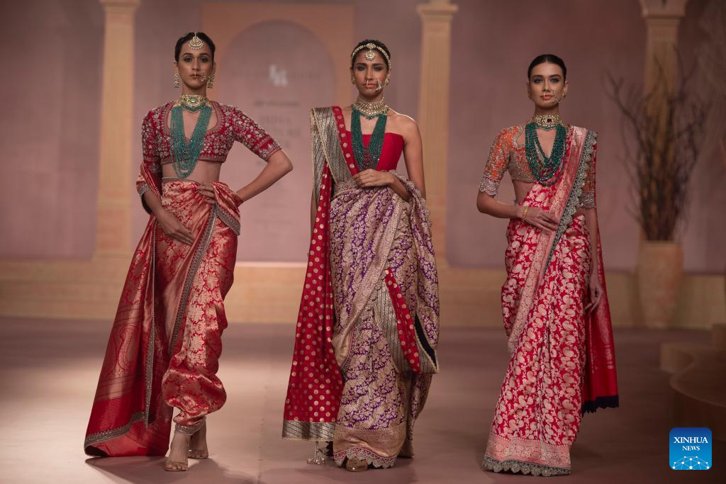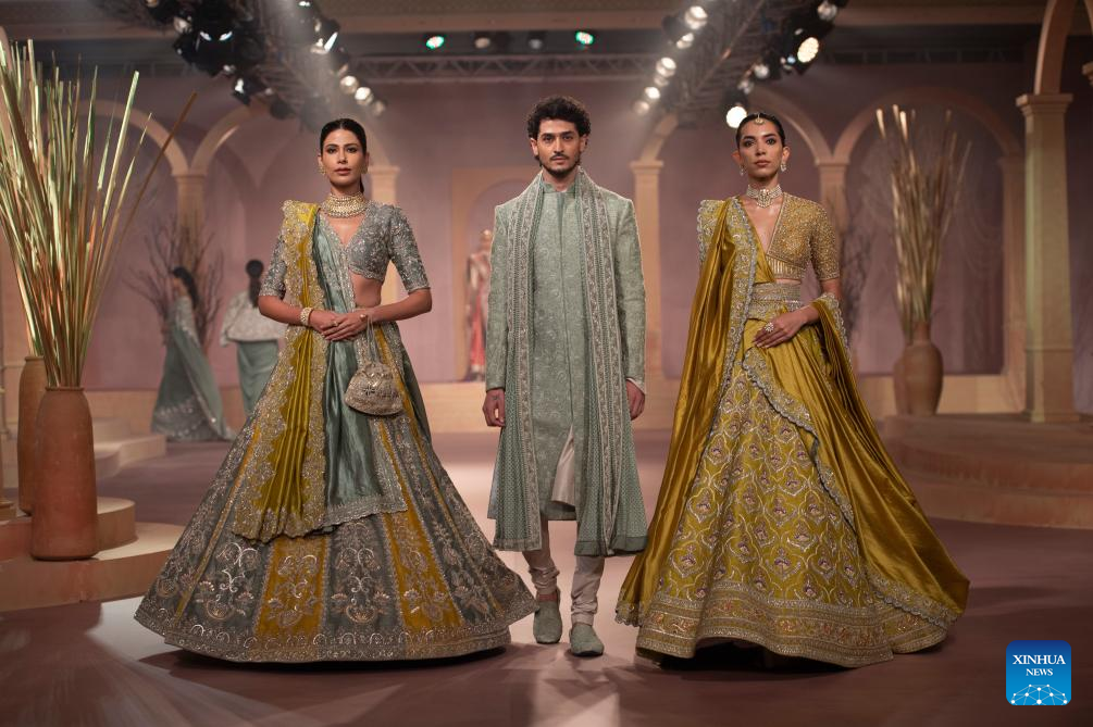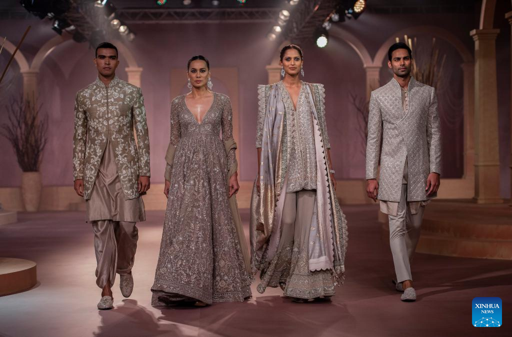 Models present creations of Jayanti Reddy during the FDCI India Couture Week in New Delhi, on July 29, 2024. (Xinhua/Javed Dar)