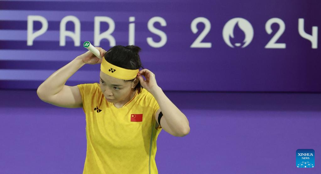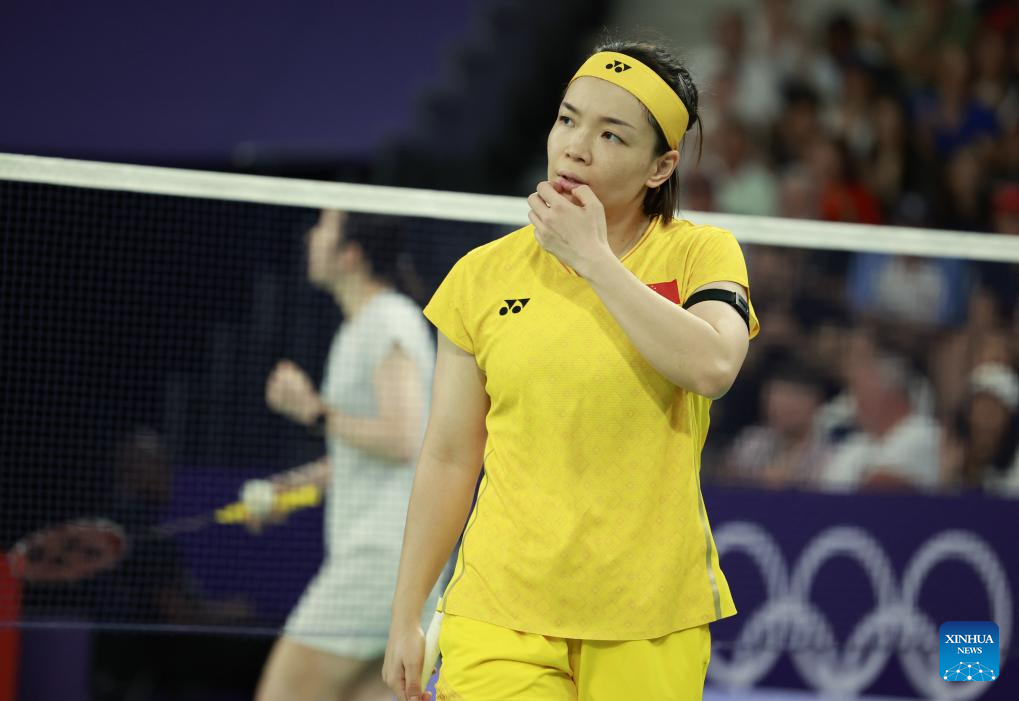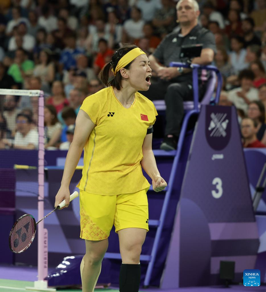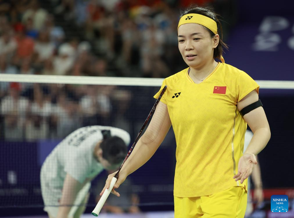 Chen Qingchen of China reacts during the badminton women's doubles group play stage match between Chen Qingchen/Jia Yifan of China and Matsumoto Mayu/Nagahara Wakana of Japan at the Paris 2024 Olympic Games in Paris, France, July 30, 2024. (Xinhua/Ren Zhenglai)