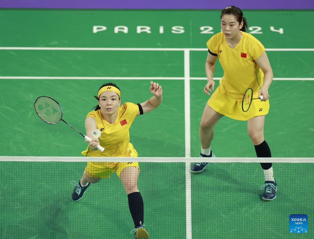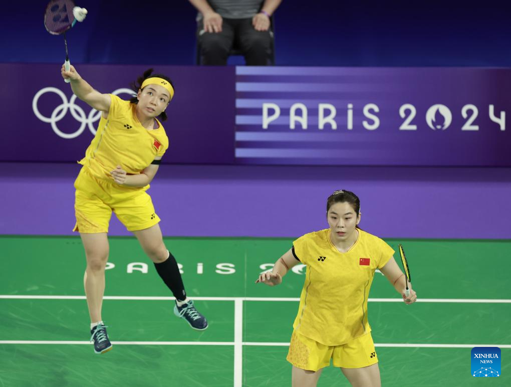 Chen Qingchen (L)/Jia Yifan of China compete during the badminton women's doubles group play stage match between Chen Qingchen/Jia Yifan of China and Matsumoto Mayu/Nagahara Wakana of Japan at the Paris 2024 Olympic Games in Paris, France, July 30, 2024. (Xinhua/Ren Zhenglai)