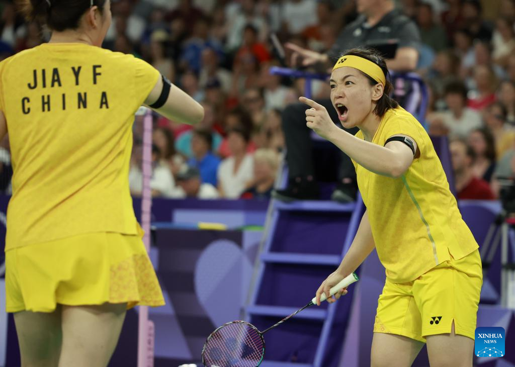 Chen Qingchen (R)/Jia Yifan of China react during the badminton women's doubles group play stage match between Chen Qingchen/Jia Yifan of China and Matsumoto Mayu/Nagahara Wakana of Japan at the Paris 2024 Olympic Games in Paris, France, July 30, 2024. (Xinhua/Ren Zhenglai)