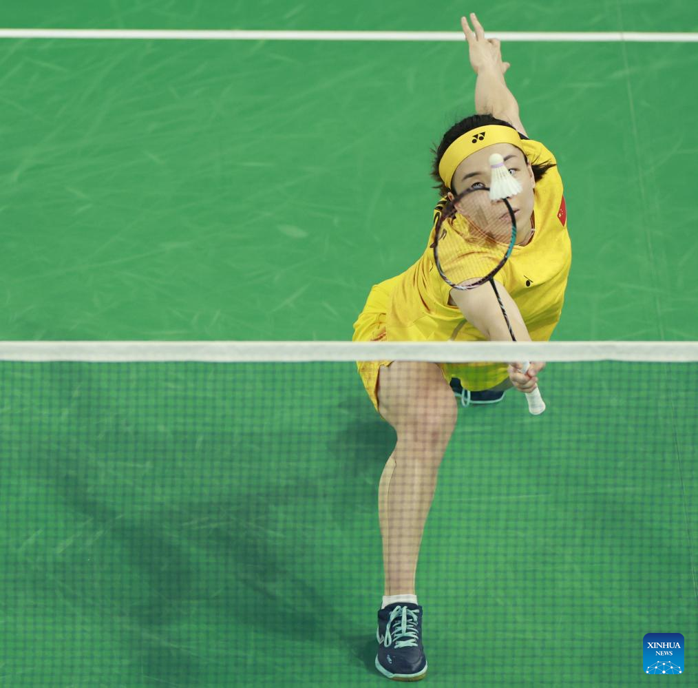 Chen Qingchen of China competes during the badminton women's doubles group play stage match between Chen Qingchen/Jia Yifan of China and Matsumoto Mayu/Nagahara Wakana of Japan at the Paris 2024 Olympic Games in Paris, France, July 30, 2024. (Xinhua/Ren Zhenglai)