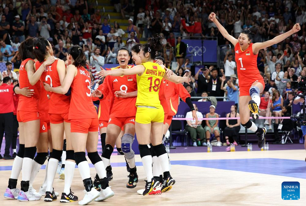Athletes of team China celebrate victory after the volleyball women's preliminary round pool A match between China and the United States at the Paris 2024 Olympic Games in Paris, France, July 29, 2024. (Xinhua/Lai Xiangdong)