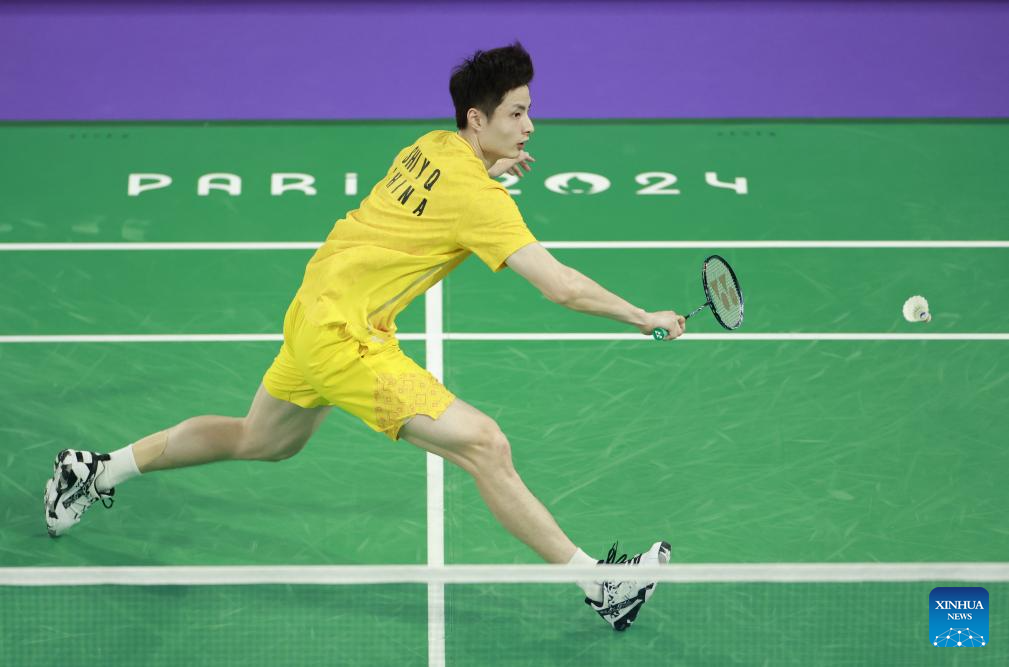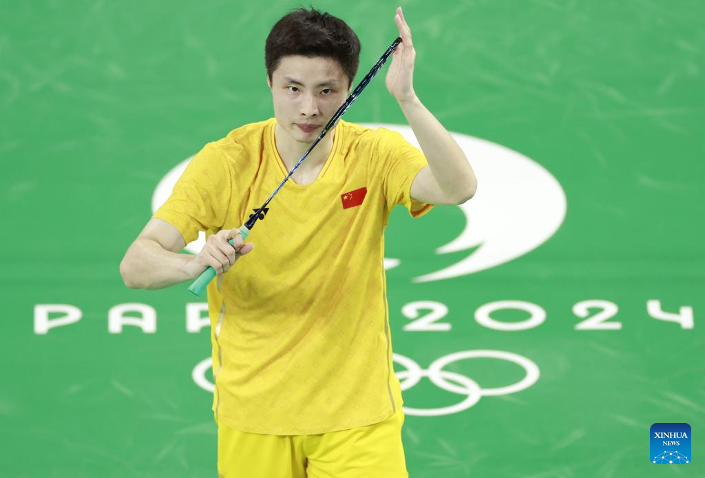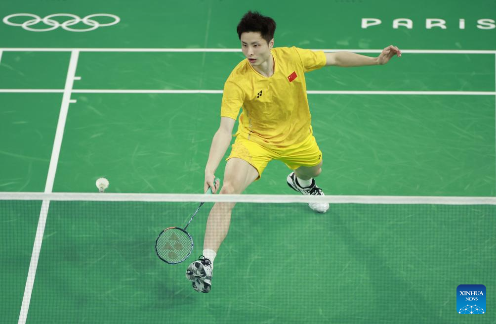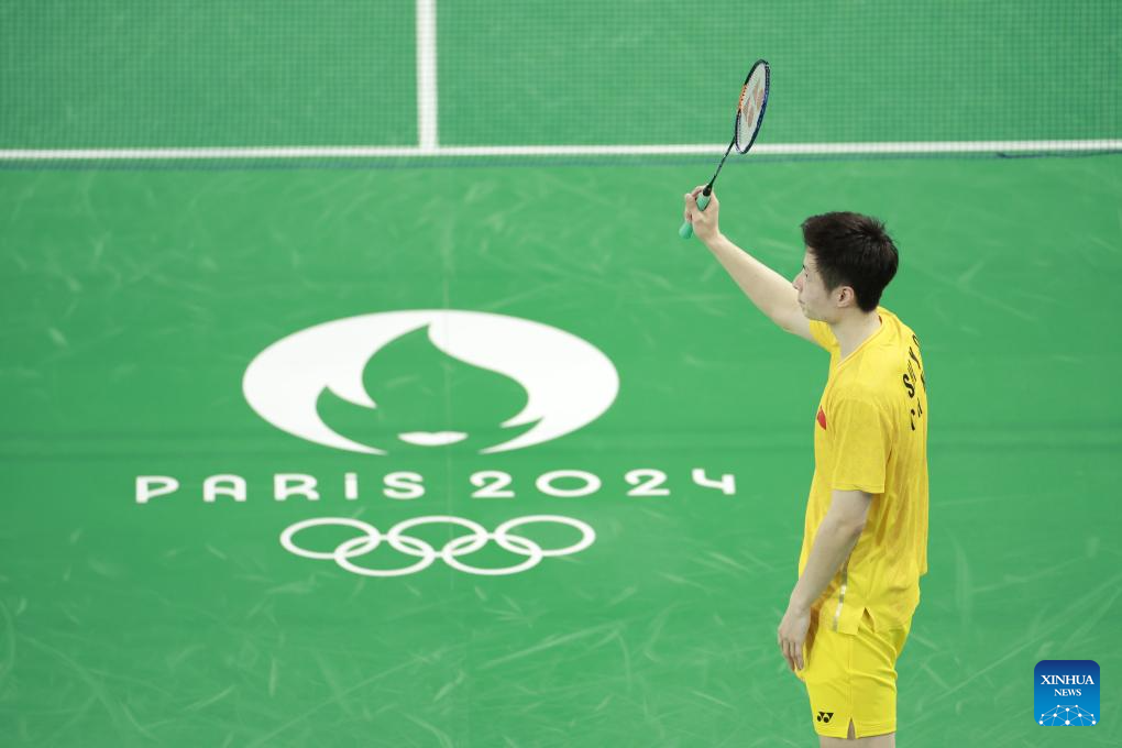 Shi Yuqi of China competes during the badminton men's singles group play stage group A match between Shi Yuqi of China and Giovanni Toti of Italy at the Paris 2024 Olympic Games, in Paris, France, July 31, 2024. (Xinhua/Ren Zhenglai)