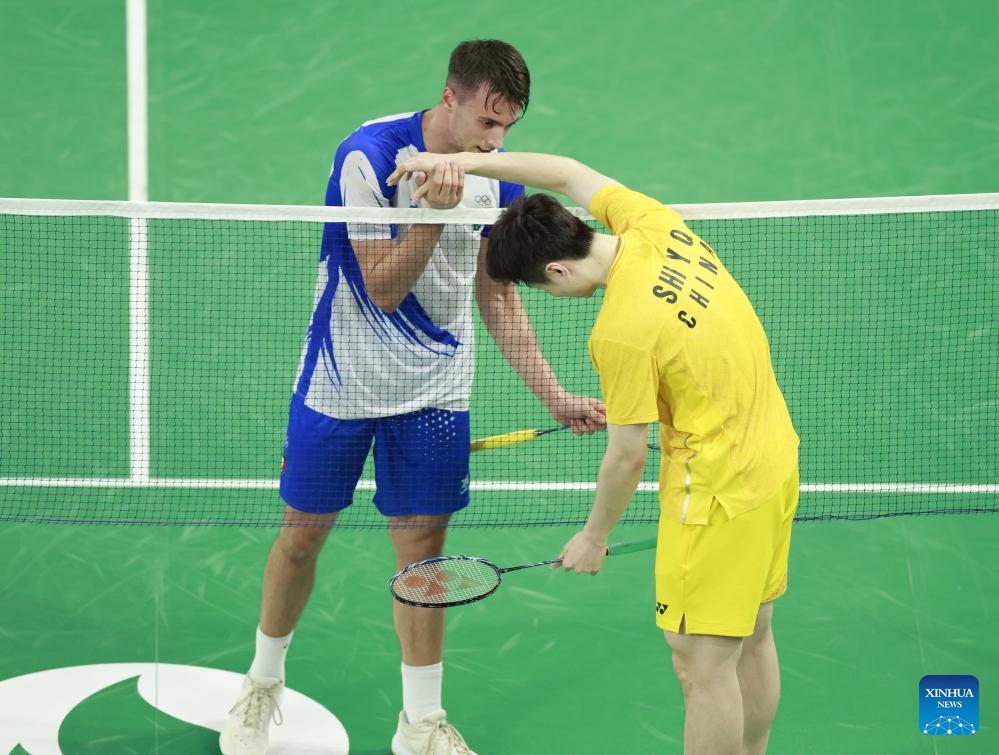 Shi Yuqi (R) of China shakes hands with Giovanni Toti of Italy after the badminton men's singles group play stage group A match between Shi Yuqi of China and Giovanni Toti of Italy at the Paris 2024 Olympic Games, in Paris, France, July 31, 2024. (Xinhua/Ren Zhenglai)