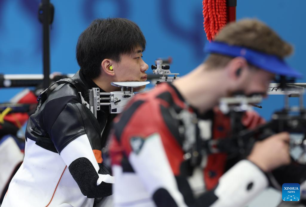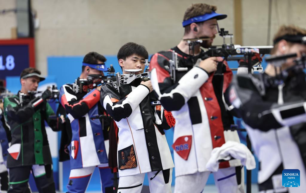 Liu Yukun of China competes during the 50m rifle 3 positions men's final of shooting at the Paris 2024 Olympic Games in Chateauroux, France, Aug. 1, 2024. (Xinhua/Zhao Dingzhe)
