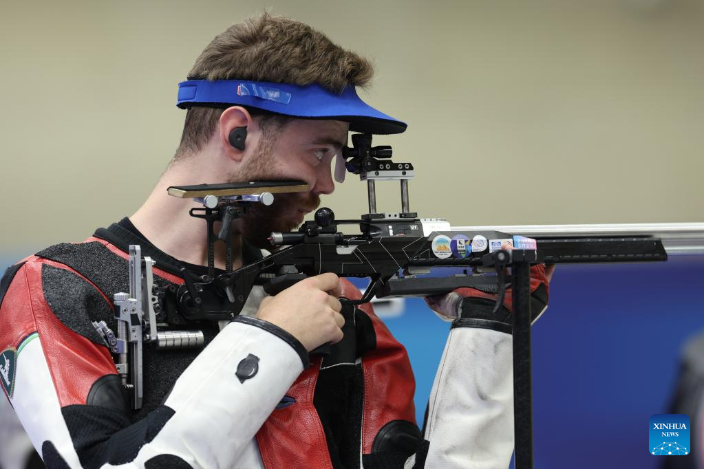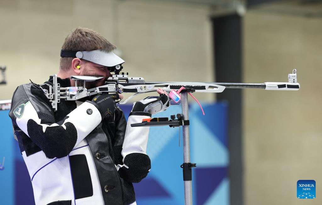 Serhiy Kulish of Ukraine competes during the 50m rifle 3 positions men's final of shooting at the Paris 2024 Olympic Games in Chateauroux, France, Aug. 1, 2024. (Xinhua/Zhang Fan)