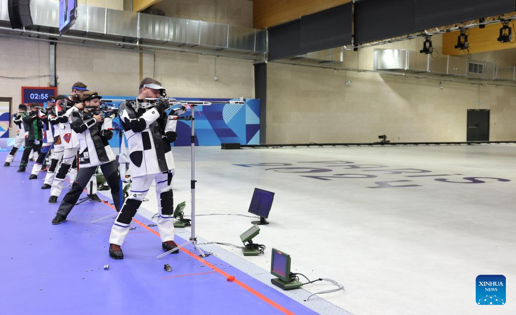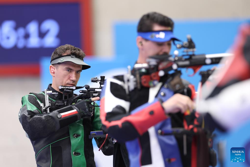 Serhiy Kulish (R) of Ukraine competes during the 50m rifle 3 positions men's final of shooting at the Paris 2024 Olympic Games in Chateauroux, France, Aug. 1, 2024. (Xinhua/Zhang Fan)