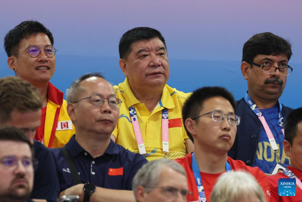 Chinese shooting legend Wang Yifu (C, back) watches the 50m rifle 3 positions men's final of shooting at the Paris 2024 Olympic Games in Chateauroux, France, Aug. 1, 2024. (Xinhua/Zhao Dingzhe)