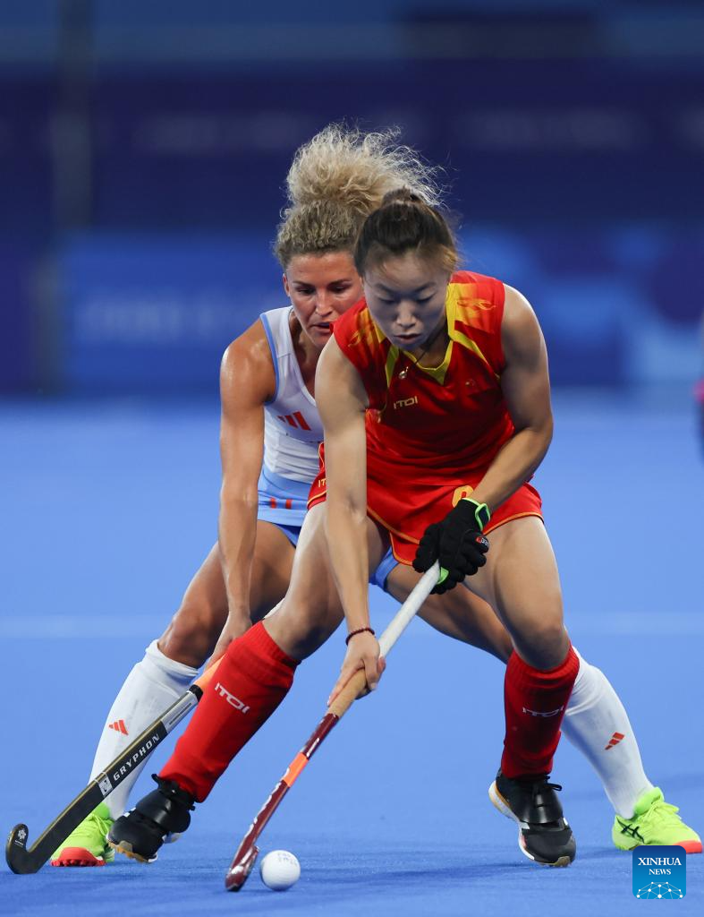 Gu Bingfeng (front) of China competes during the women's pool A match of hockey between the Netherlands and China in Colombes, northwest suburbs of Paris, France, July 31, 2024. (Xinhua/Ren Pengfei)