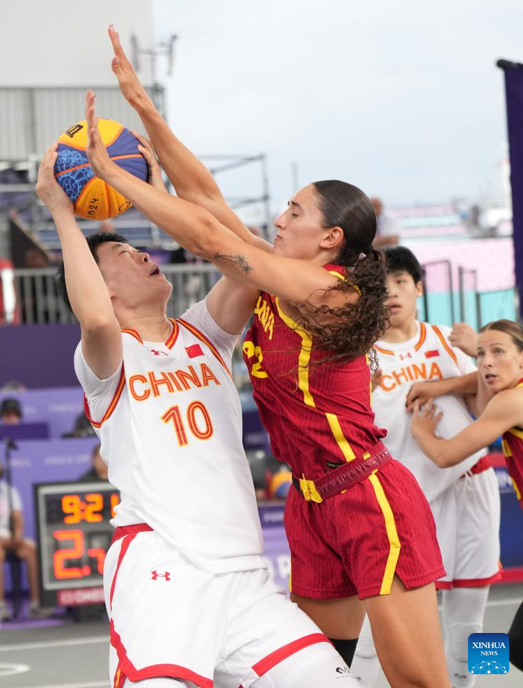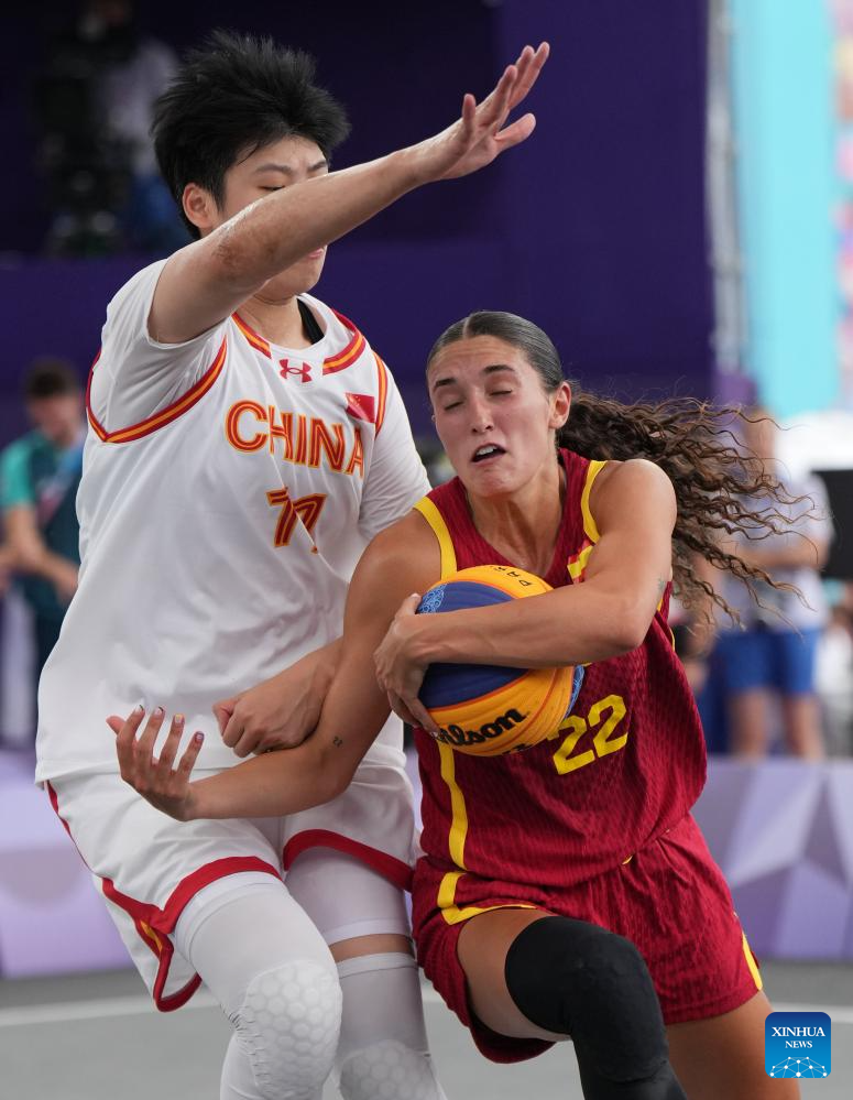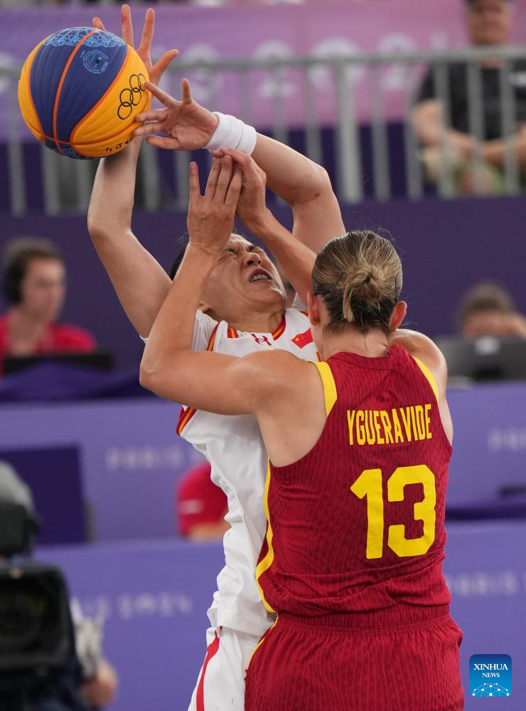 Zhang Zhiting (L) of China competes during the 3x3 basketball women's pool round game between China and Spain at the Paris 2024 Olympic Games in Paris, France, on Aug. 1, 2024. (Xinhua/Meng Yongmin)