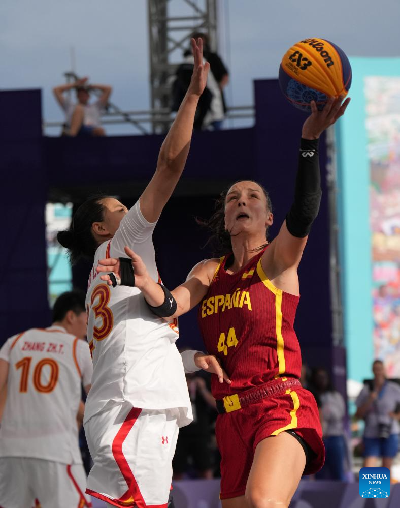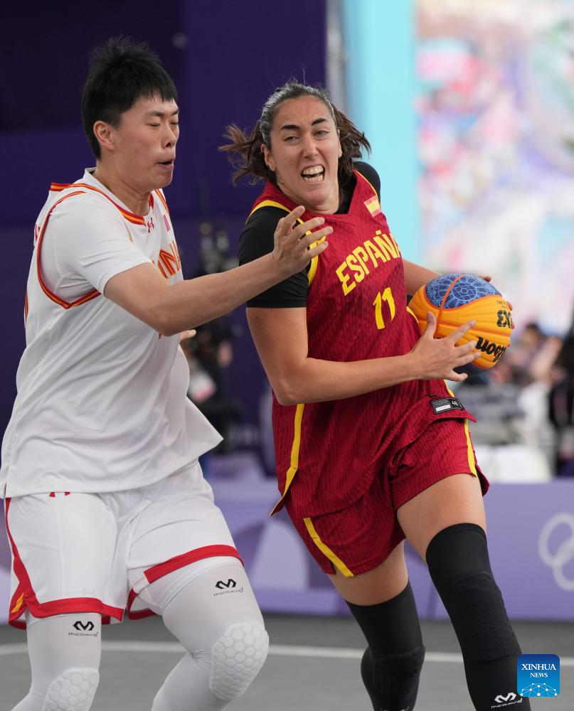 Vega Gimeno (R) of Spain drives during the 3x3 basketball women's pool round game between China and Spain at the Paris 2024 Olympic Games in Paris, France, on Aug. 1, 2024. (Xinhua/Meng Yongmin)