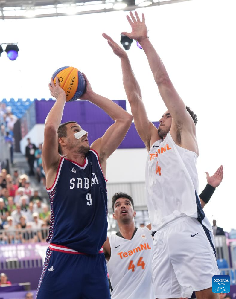 Mihailo Vasic (L) of Serbia shoots during the men's pool round of 3x3 basketball between the Netherlands and Serbia at the Paris 2024 Olympic Games in Paris, France, July 30, 2024. (Xinhua/Meng Yongmin)