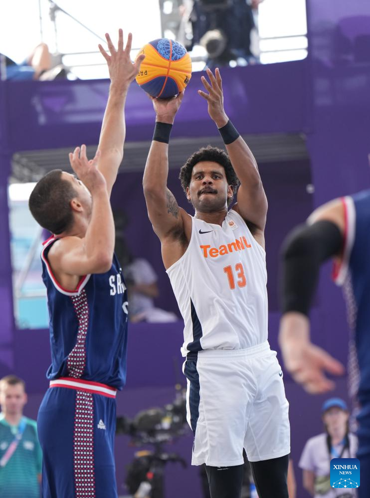 Dimeo van der Horst (R) of the Netherlands shoots during the men's pool round of 3x3 basketball between the Netherlands and Serbia at the Paris 2024 Olympic Games in Paris, France, July 30, 2024. (Xinhua/Meng Yongmin)