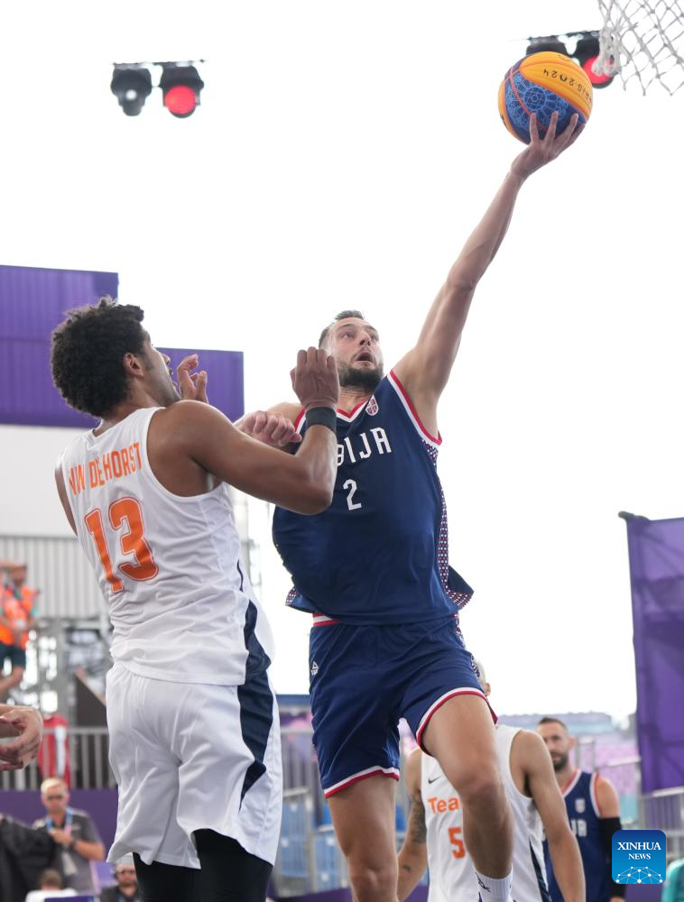 Marko Brankovic (R) of Serbia makes a layup during the men's pool round of 3x3 basketball between the Netherlands and Serbia at the Paris 2024 Olympic Games in Paris, France, July 30, 2024. (Xinhua/Meng Yongmin)