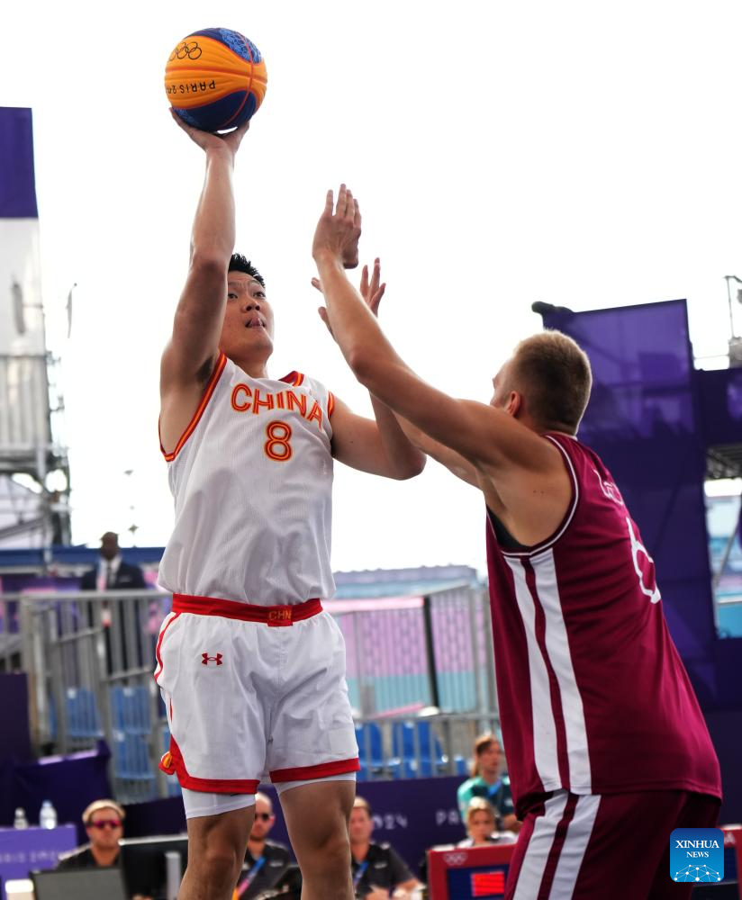 Zhang Ning (L) of China shoots during the 3x3 basketball men's pool round game between China and Latvia at the Paris 2024 Olympic Games in Paris, France, on Aug. 1, 2024. (Xinhua/Meng Yongmin)