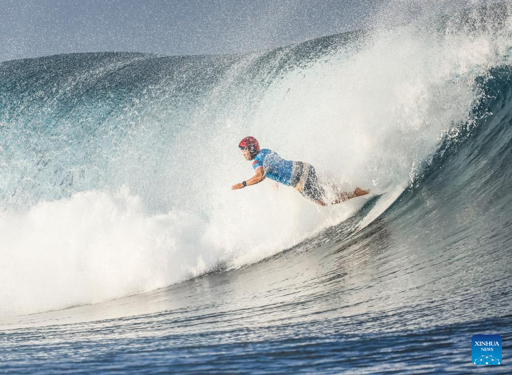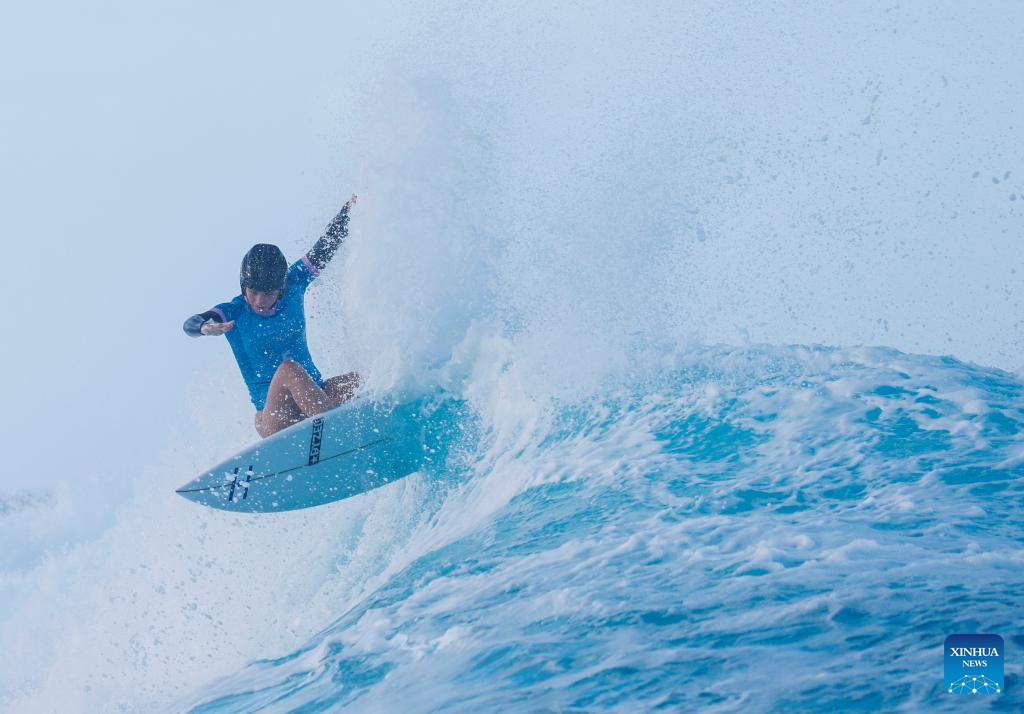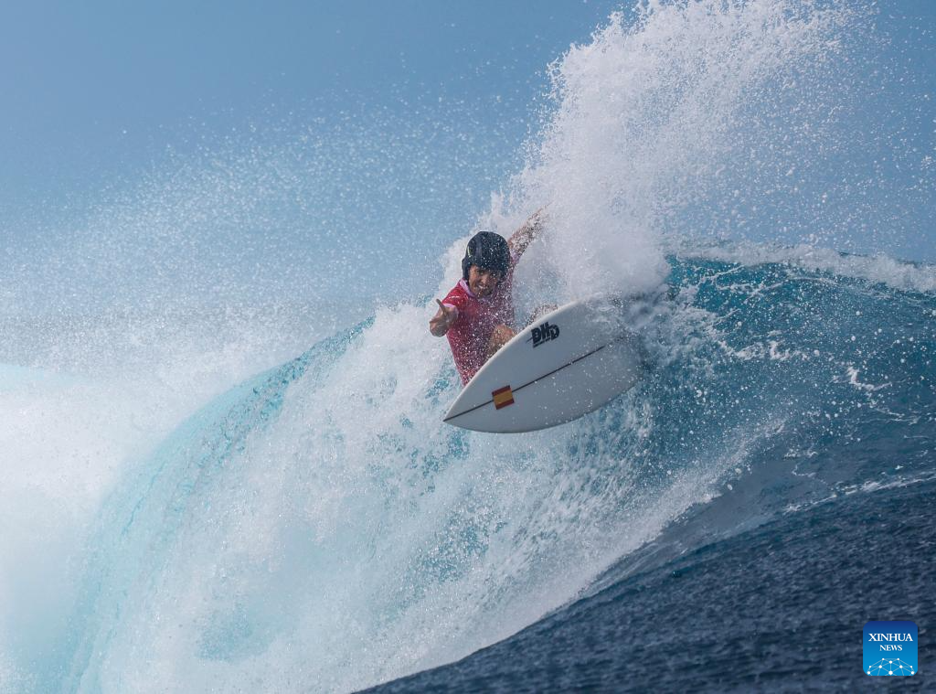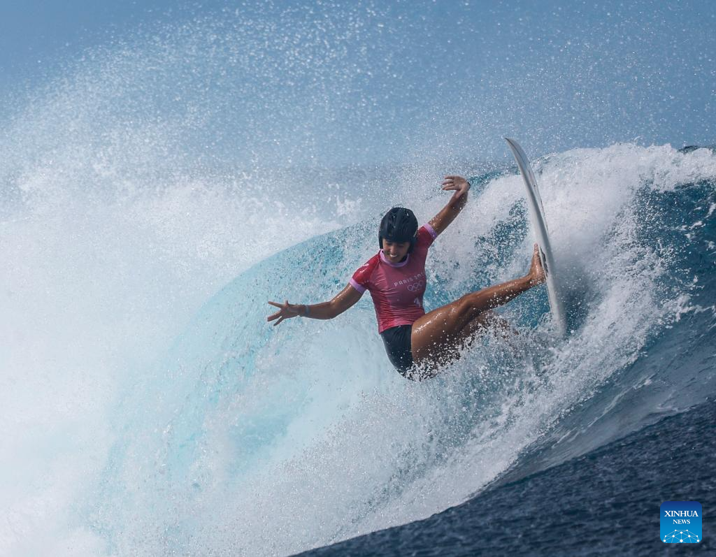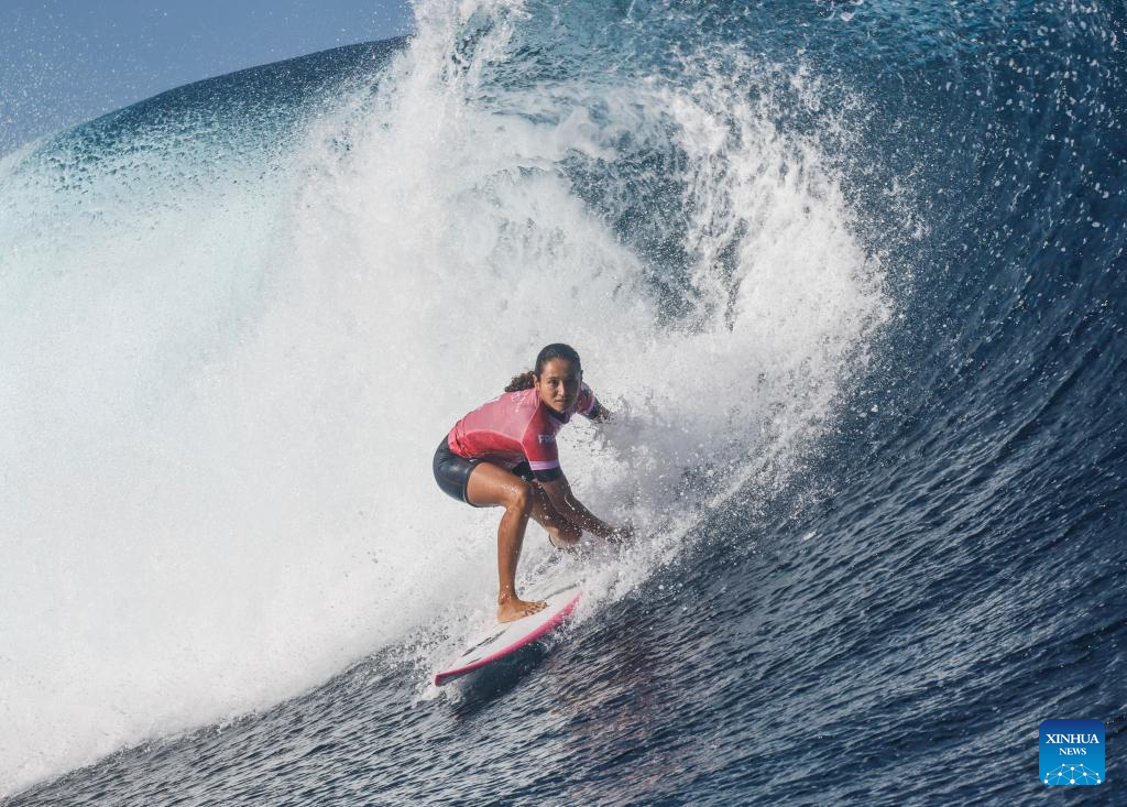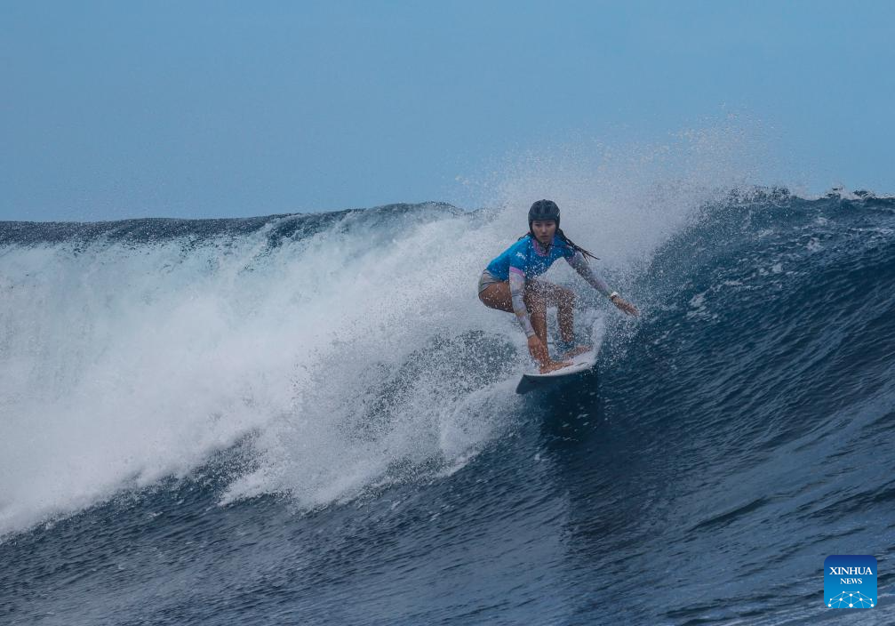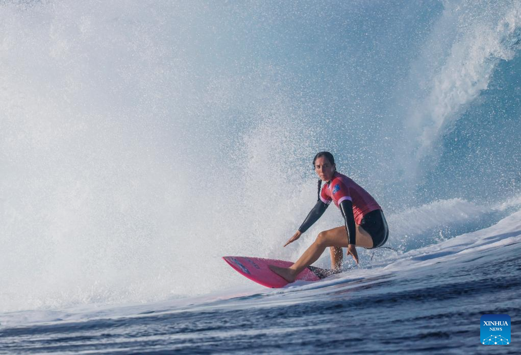 Nadia Erostarbe of Spain competes during the women's round 3 heat of surfing of the Paris 2024 Olympic Games in Teahupo'o, Tahiti, French Polynesia, on Aug. 1, 2024. (Xinhua/Ma Ping)