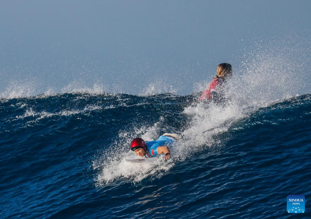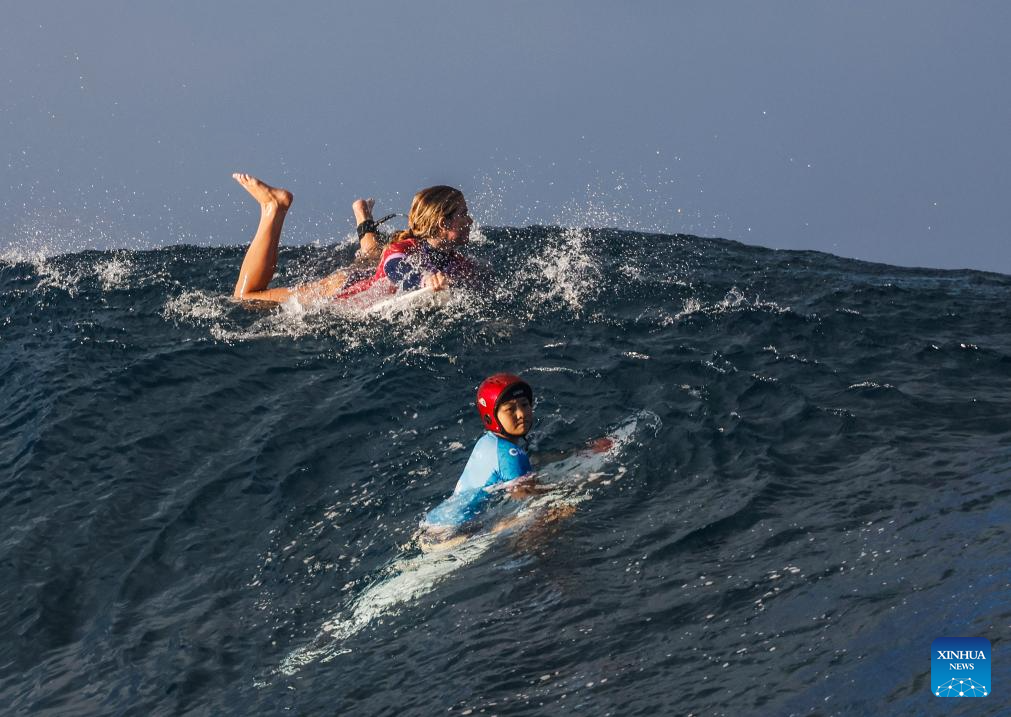 Yang Siqi (back) of China reacts after the women's round 3 heat of surfing of the Paris 2024 Olympic Games in Teahupo'o, Tahiti, French Polynesia, on Aug. 1, 2024. (Xinhua/Ma Ping)