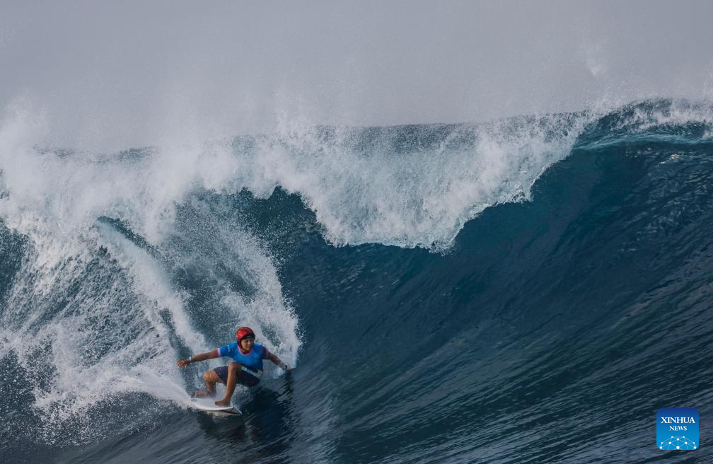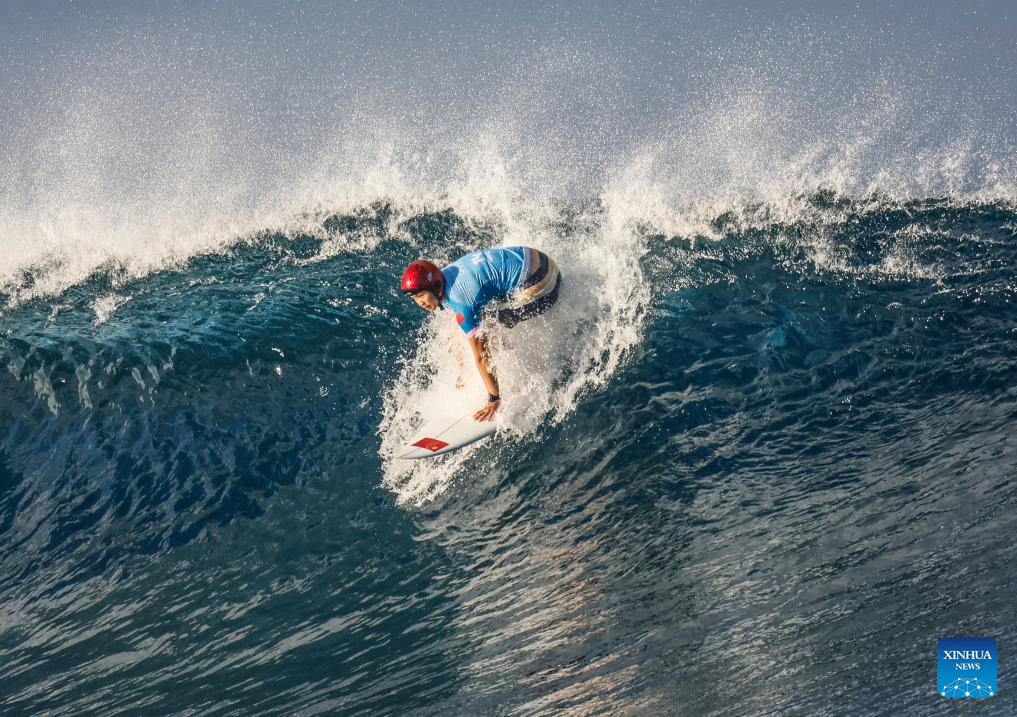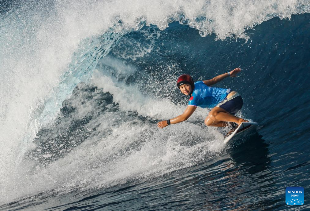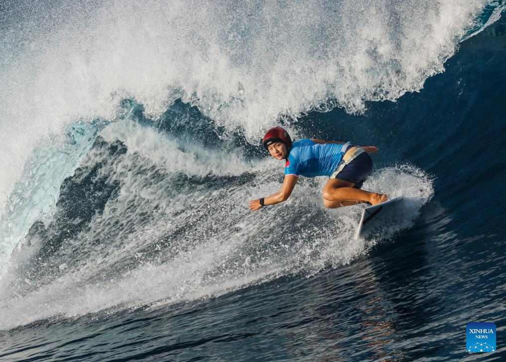 Yang Siqi of China competes during the women's round 3 heat of surfing of the Paris 2024 Olympic Games in Teahupo'o, Tahiti, French Polynesia, on Aug. 1, 2024. (Xinhua/Ma Ping)