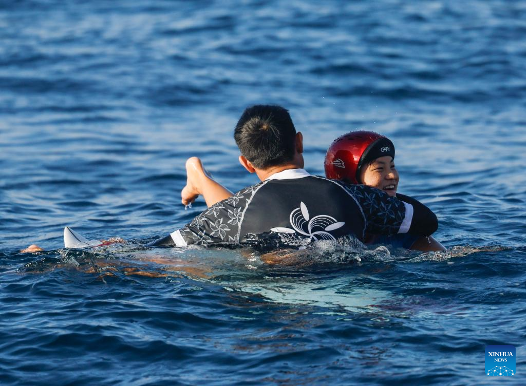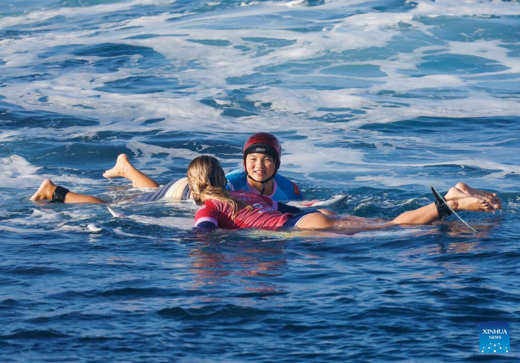Yang Siqi (back) of China greets Caroline Marks of the United States after the women's round 3 heat of surfing of the Paris 2024 Olympic Games in Teahupo'o, Tahiti, French Polynesia, on Aug. 1, 2024. (Xinhua/Ma Ping)