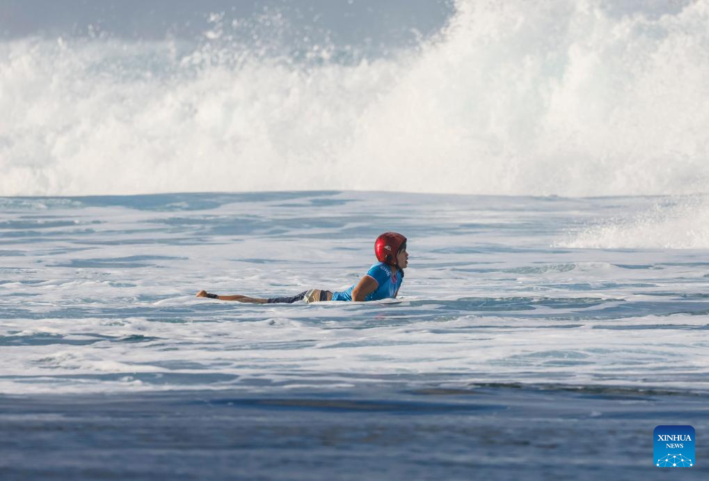 Yang Siqi of China is seen during the women's round 3 heat of surfing of the Paris 2024 Olympic Games in Teahupo'o, Tahiti, French Polynesia, on Aug. 1, 2024. (Xinhua/Ma Ping)