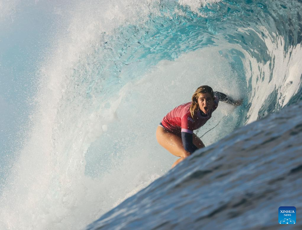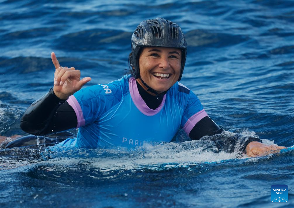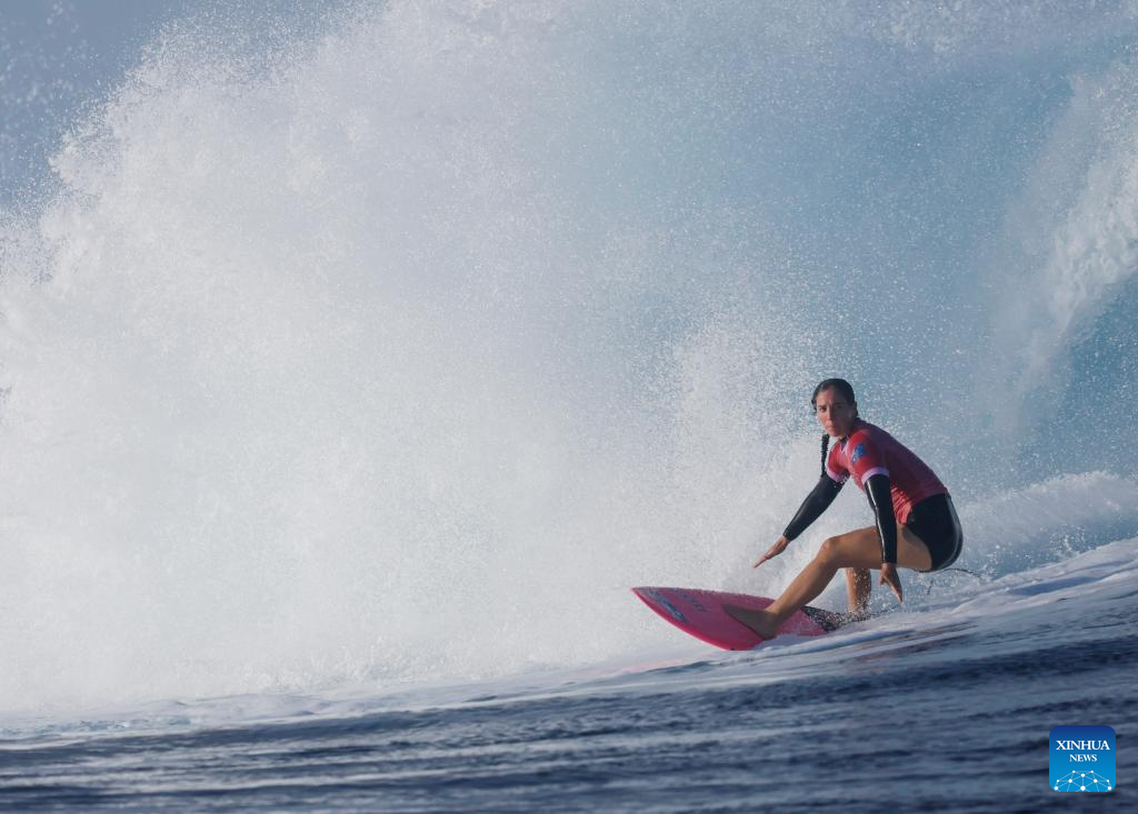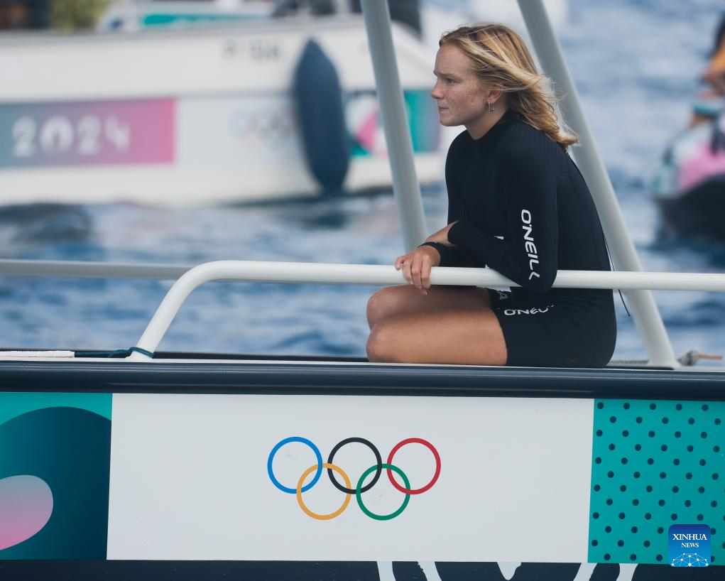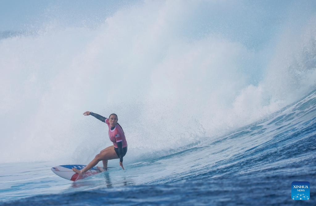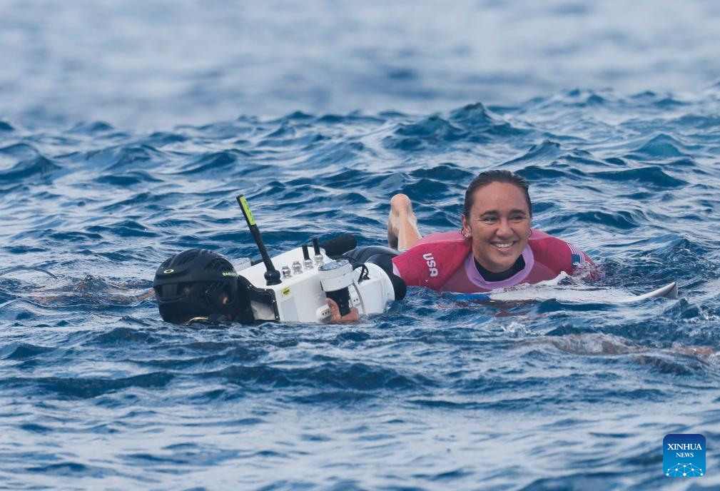 Carissa Moore of the United States is seen after the women's round 3 heat of surfing of the Paris 2024 Olympic Games in Teahupo'o, Tahiti, French Polynesia, on Aug. 1, 2024. (Xinhua/Ma Ping)