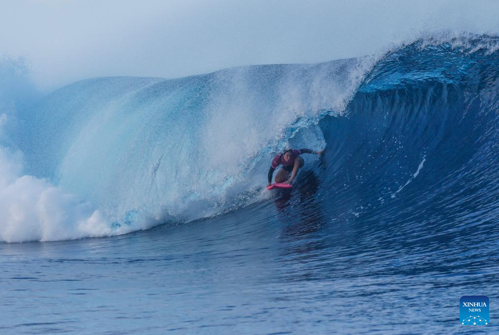 Vahine Fierro of France competes during the women's round 3 heat of surfing of the Paris 2024 Olympic Games in Teahupo'o, Tahiti, French Polynesia, on Aug. 1, 2024. (Xinhua/Ma Ping)