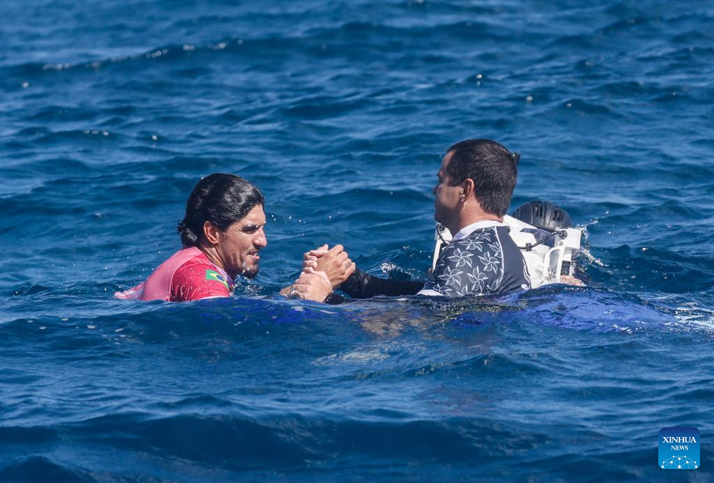 Gabriel Medina (L) of Brazil reacts after the men's quarterfinals of surfing of the Paris 2024 Olympic Games in Teahupo'o, Tahiti, French Polynesia, on Aug. 1, 2024. (Xinhua/Ma Ping)