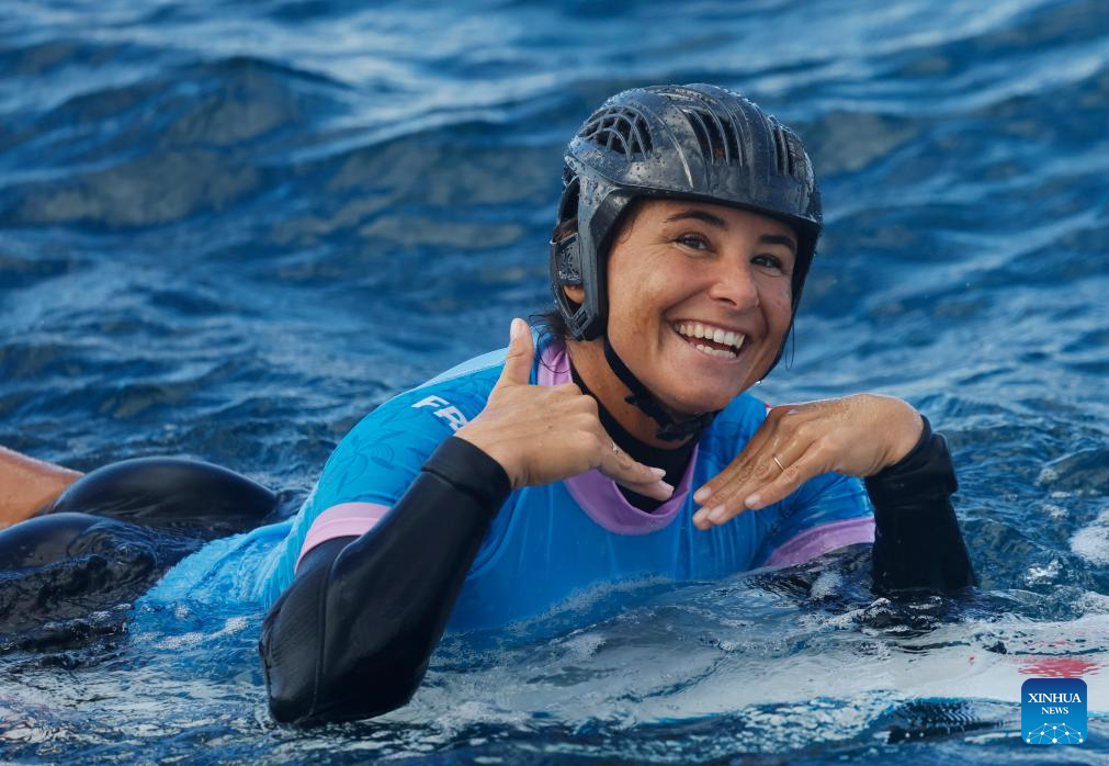 Johanne Defay of France is seen after the women's round 3 heat of surfing of the Paris 2024 Olympic Games in Teahupo'o, Tahiti, French Polynesia, on Aug. 1, 2024. (Xinhua/Ma Ping)