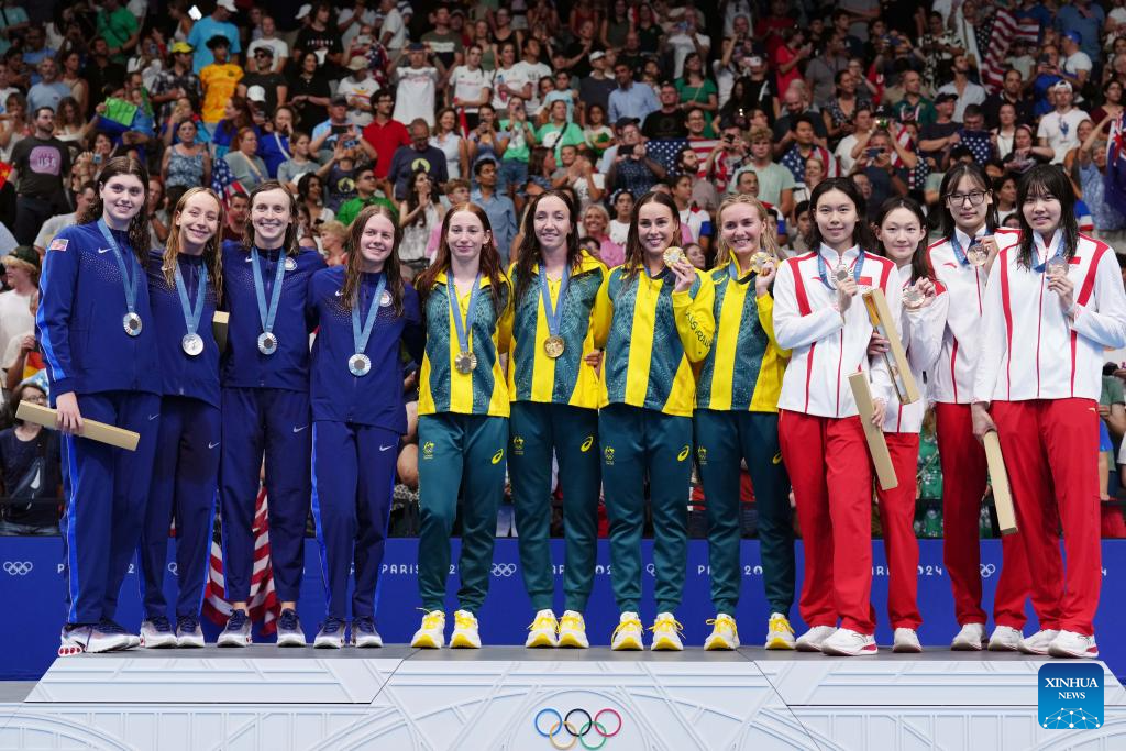 Medalists attend the victory ceremony for the women's 4 x 200m freestyle relay of swimming at Paris 2024 Olympic Games in Paris, France, on Aug. 1, 2024. (Xinhua/Du Yu)