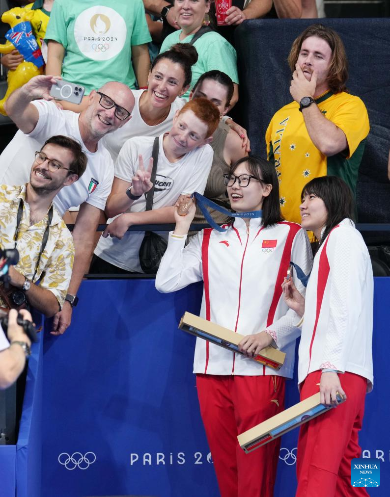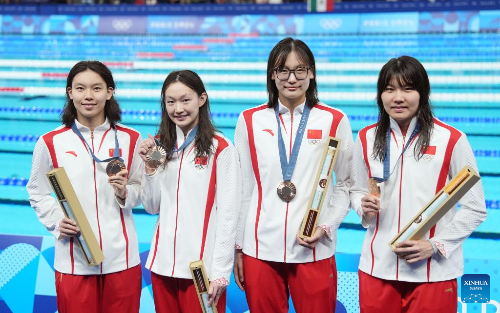 Bronze medalists of Team China pose for photos after the victory ceremony for the women's 4 x 200m freestyle relay of swimming at Paris 2024 Olympic Games in Paris, France, on Aug. 1, 2024. (Xinhua/Du Yu)