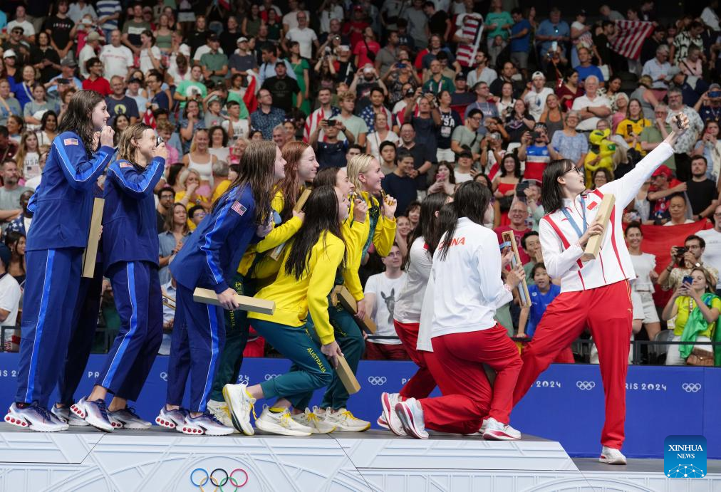 Medalists take selfies during the victory ceremony for the women's 4 x 200m freestyle relay of swimming at Paris 2024 Olympic Games in Paris, France, on Aug. 1, 2024. (Xinhua/Du Yu)