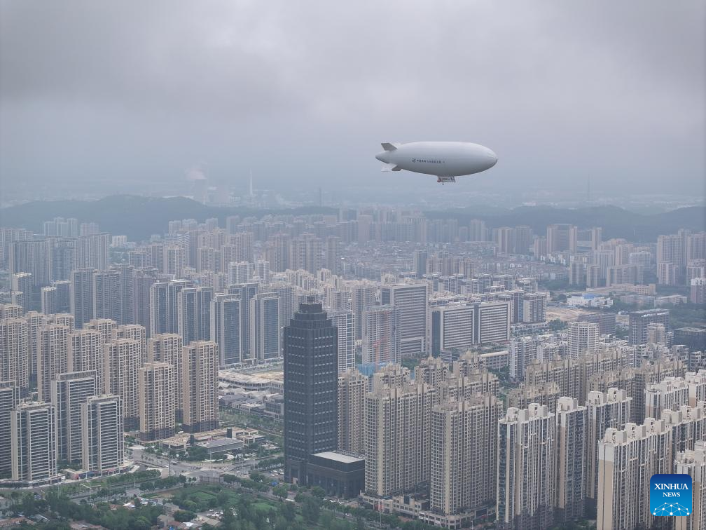 AS700 airship conducts a low-altitude demo flight in Jingmen, central China's Hubei Province, Aug. 1, 2024. Low-altitude tourism in China is embracing a new mode as the country's homegrown AS700 civil manned airship on Thursday successfully made its first demonstration flight. (Aviation Industry Corporation of China/Handout via Xinhua)