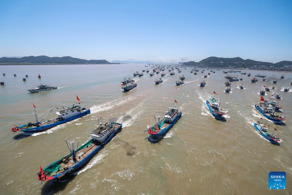 Fishing boats depart for fishing from the Shenjiamen fishing port in Zhoushan City, east China's Zhejiang Province, Aug. 1, 2024. Four types of fishing boats with special permission set sail on Thursday after a three-month summer fishing ban in the East China Sea. (Xinhua/Xu Yu)