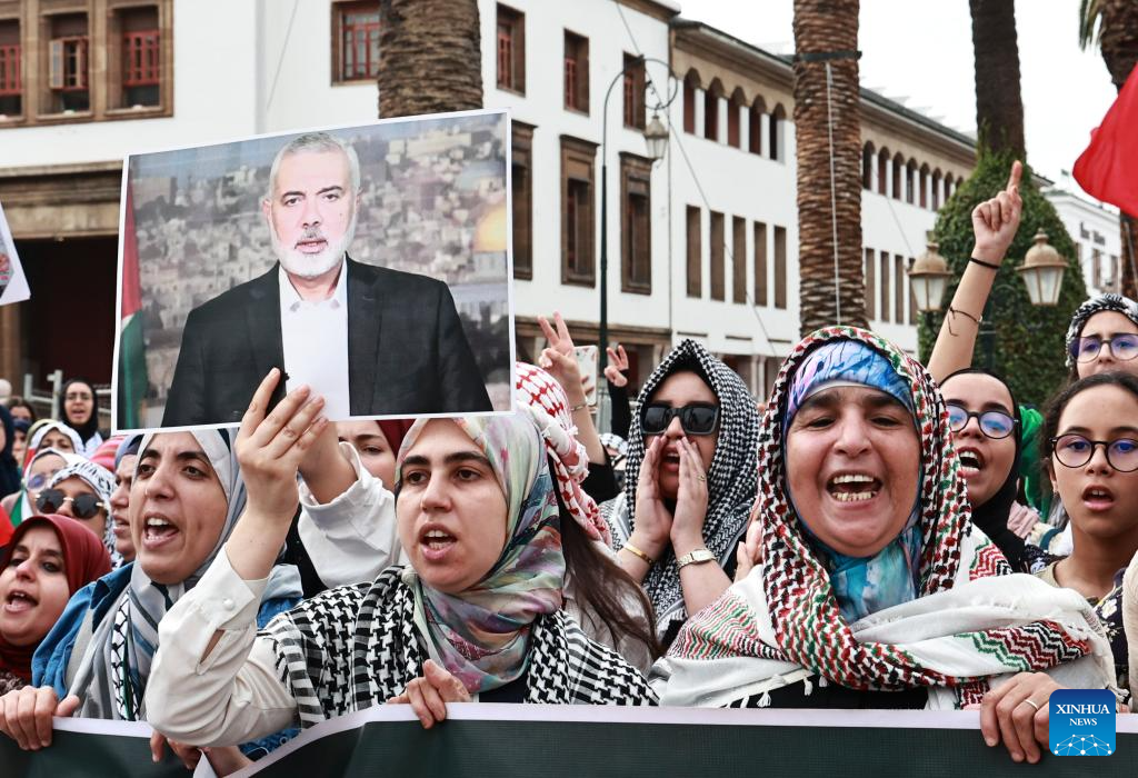 People take part in a protest near the Parliament building against the assassination of Hamas Politburo Chief Ismail Haniyeh and voice support for Palestinian people, in Rabat, Morocco on July 31, 2024. (Xinhua/Huo Jing)
