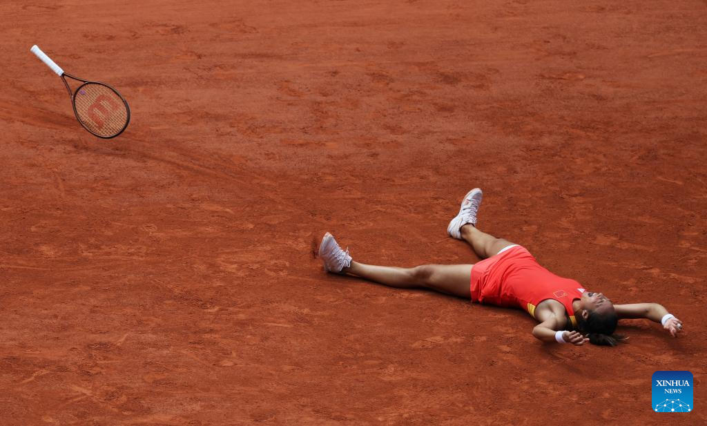 Zheng Qinwen of China celebrates after winning the women's singles semi-final match of tennis between Zheng of China and Iga Swiatek of Poland at the Paris 2024 Olympic Games in Paris, France, on Aug. 1, 2024. (Xinhua/Gao Jing)